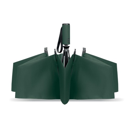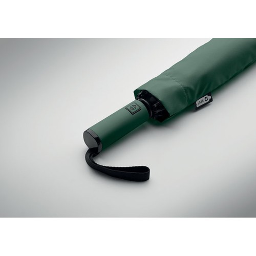 Parapluie de 23'' 3 plis, en pongé RPET 190T pochette assortie. Ouverture et fermeture automatiques, armature entièrement plaquée noire, baleines en fibre de verre, poignée en ABS finition caoutchouc.