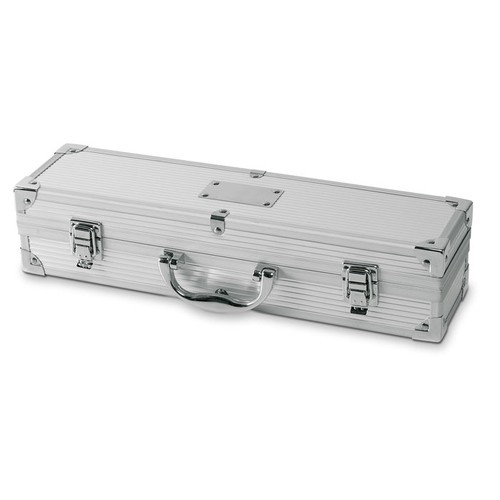 Très beau coffret barbecue 3 pièces dans une valise en aluminium. Plaque pour impression du logo.