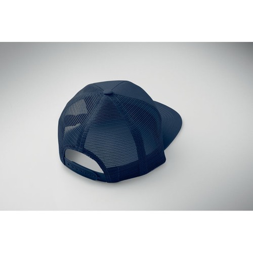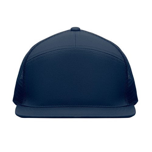 Casquette à visière plate à 7 panneaux en sergé de coton avec maille en polyester à l'arrière et fermeture en plastique.