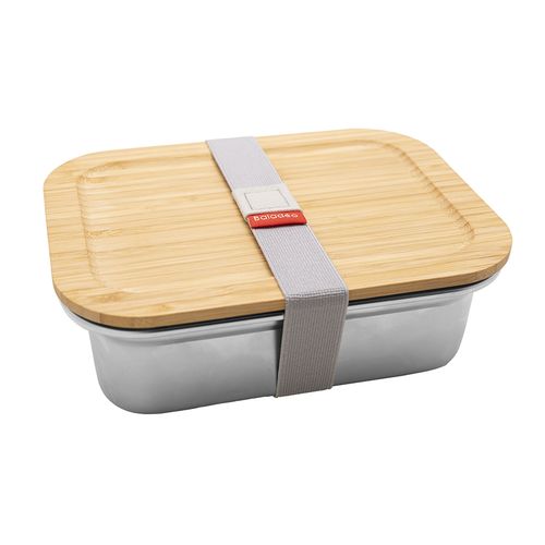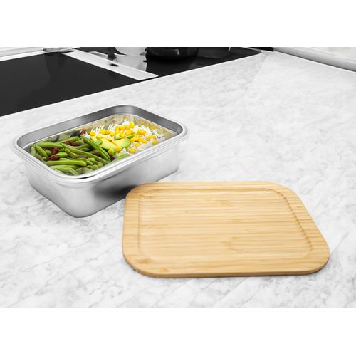 Boîte déjeuner (lunch box) simple compartiment. Contenant en acier inoxydable 304 conforme aux normes de contact alimentaire ayant la capacité de passer dans les fours à micro- ondes (Sans le couvercle à 100° et 2 minutes max). Couvercle en bambou avec joints en silicone pour une étanchéité parfaite. Compatible également (sans le couvercle) avec lave- vaisselle (50° max) et congélateur. Contenance : 1,2L.