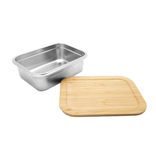 Boîte déjeuner (lunch box) simple compartiment. Contenant en acier inoxydable 304 conforme aux normes de contact alimentaire ayant la capacité de passer dans les fours à micro- ondes (Sans le couvercle à 100° et 2 minutes max). Couvercle en bambou avec joints en silicone pour une étanchéité parfaite. Boîte repas compatible également (sans le couvercle) avec lave- vaisselle (50° max) et congélateur. Contenance : 1,2 L.