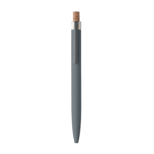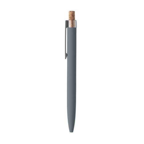 Stylo bille en aluminium recyclé avec bouton poussoir en liège et clip en métal. Encre bleue.