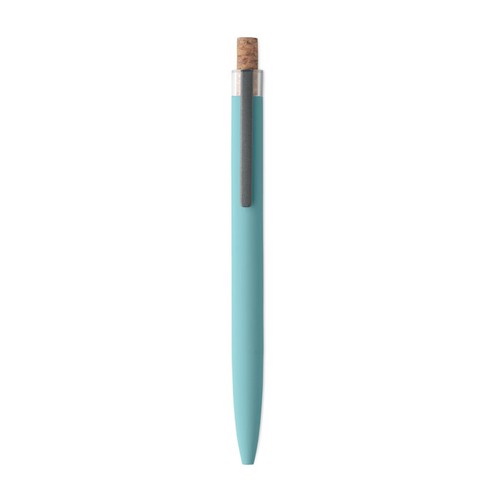 Stylo bille en aluminium recyclé avec bouton poussoir en liège et clip en métal. Encre bleue.