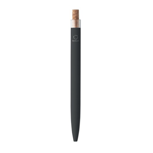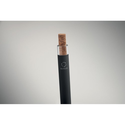 Stylo bille en aluminium recyclé avec bouton poussoir en liège et clip en métal. Encre bleue.