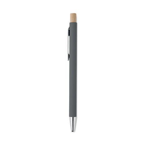 Stylo à bille en aluminium recyclé avec bouton poussoir en bambou. Pointe et clip argentés. Encre bleue.
