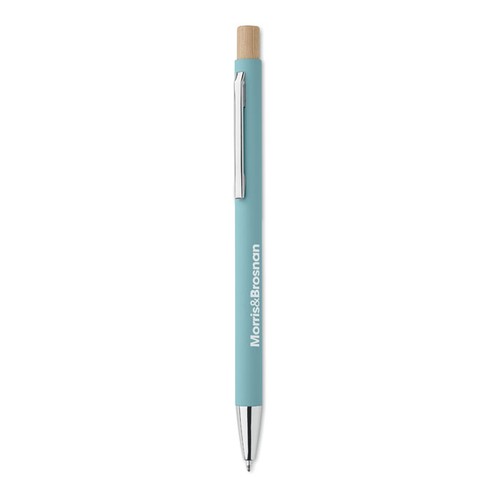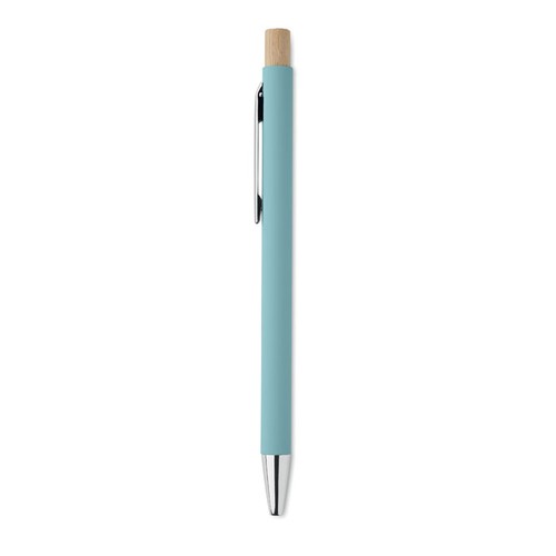 Stylo à bille en aluminium recyclé avec bouton poussoir en bambou. Pointe et clip argentés. Encre bleue.