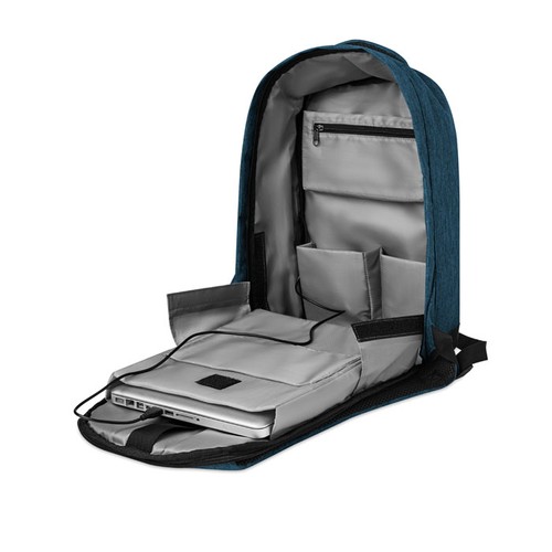Sac à dos en polyester 600D 2 tons avec bandoulière rembourrée et compartiment interne principal. Comprend un compartiment pour ordinateur portable interne de 13 inch et un câble de chargement USB. Fermeture à glissière sur l'arrière pour une meilleure protection.