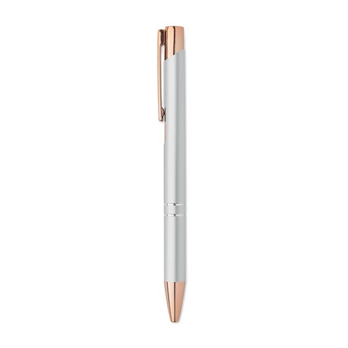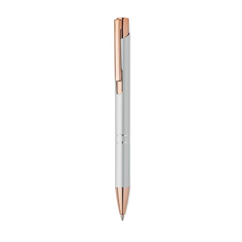 Stylo à bouton poussoir en aluminium recyclé avec détails en façon or rose. Encre bleue.