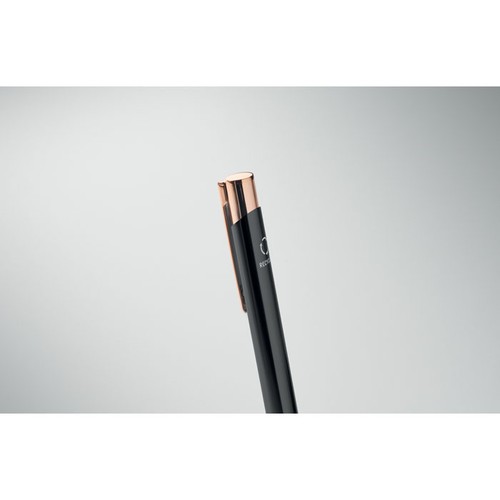 Stylo à bouton poussoir en aluminium recyclé avec détails en façon or rose. Encre bleue.