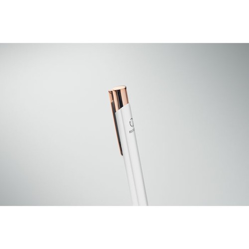 Stylo à bouton poussoir en aluminium recyclé avec détails en façon or rose. Encre bleue.