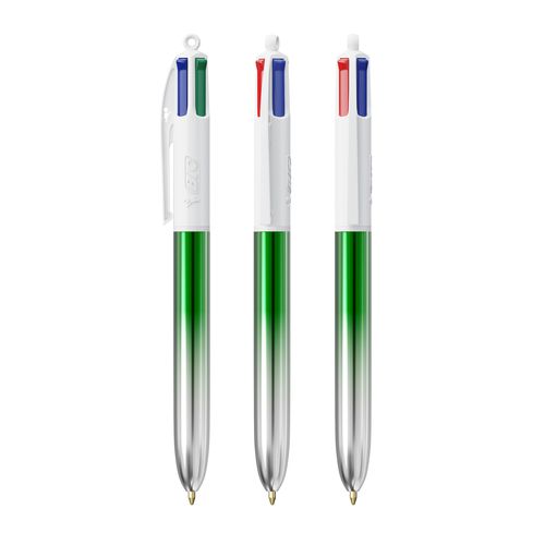 Découvrez notre BIC® 4 Couleurs® Bicolor ! Son effet métallique brillant unique combine 2 couleurs brillantes sur le corps, pour les designs les plus créatifs et un look métallique avec une touche artistique ! Nos stylos à bille BIC® 4 Couleurs® ont une longueur d'écriture moyenne de 8 000 m (tests SGS - longueur d'écriture moyenne pour les cartouches bleue, noire, rouge et verte). Notre emblématique BIC® 4 Couleurs® devient plus durable, avec désormais 13 % de plastique en moins dans la partie supérieure !