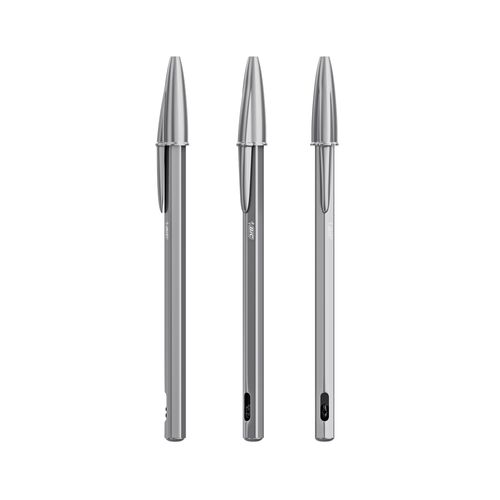 Stylo à bille premium BIC® Cristal Re'New rechargeable à encre bleue ou noire et 2 recharges incluses pour vous permettre d'écrire longtemps. Le stylo est doté d'un corps en métal argenté mat durable et d'un capuchon en plastique recyclé à 96 %. La même forme hexagonale ingénieuse que le BIC® Cristal d'origine pour une bonne adhérence et un bon confort. Conception durable, qualité et valeur intemporelle. Le produit est livré dans la boîte BIC® Window Box.
