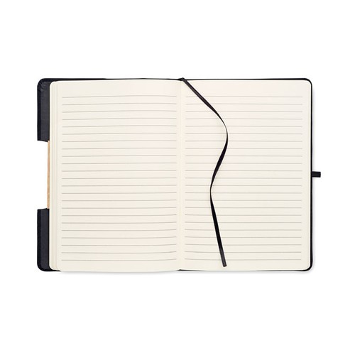 Carnet de notes A5 avec couverture rigide en RPET 600D avec détail en bambou avec une fonction de support pour smartphone. . 160 pages lignées (80 feuilles). Papier recyclé 70 g/m². Sangle de fermeture élastique assortie, marqueur de page en ruban et porte- stylo. Emportez cet indispensable du bureau à votre prochaine réunion. Vous avez une réunion à distance ? Ouvrez le support de téléphone et insérez- y votre appareil pour ne pas avoir à le tenir vous- même. FSC®- certified | FSC MIX CREDIT, P7.1, FSC- C213206