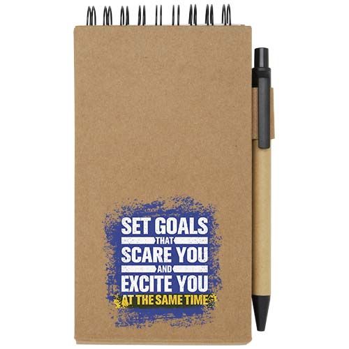 Bloc- notes autocollant avec stylo bille. Le bloc- notes comporte 30 feuilles de papier blanc ligné de 70 g/m2 (8 x 12 cm). Il contient également 25 notes autocollantes multicolores (5 x 1,2 cm) et 25 notes autocollantes jaunes (7,5 x 7,5 cm), toutes deux en papier de 70 g/m2. Le corps du stylo bille est en papier recyclé. Couleur de l'encre : Noire. Longueur d'écriture : 1000 mètres. Taille de la plume : 1,00 mm.