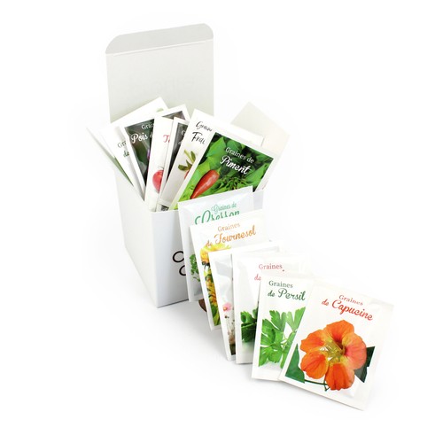 • 12 Sachets graines thermosoudés sur les côtés donc étanche (Papier PE)