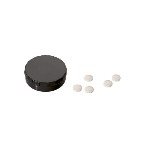 En un seul clic, vous pouvez ouvrir cette boîte de bonbons à la menthe fabriqué en Europe, et avec un mouvement de main simple vous le refermez. Existe en différentes couleurs. Contient 12 grammes de bonbons à la menthe avec sucre. Possibilité de marquage en digital (quadri) ou en tampographie (4 couleurs pantones). Avec le marquage digital, le prix reste le même peu importe le nombre de couleurs de marquage. Le logo peut être uniquement positionné sur le couvercle. Tous nos produits sont testés et certifiés, et répondent aux normes sociales.