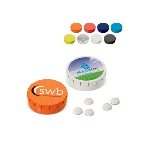 En un seul clic, vous pouvez ouvrir cette boîte de bonbons à la menthe fabriqué en Europe, et avec un mouvement de main simple vous le refermez. Existe en différentes couleurs. Contient 12 grammes de bonbons à la menthe avec sucre. Possibilité de marquage en digital (quadri) ou en tampographie (4 couleurs pantones). Avec le marquage digital, le prix reste le même peu importe le nombre de couleurs de marquage. Le logo peut être uniquement positionné sur le couvercle. Tous nos produits sont testés et certifiés, et répondent aux normes sociales.Matières :Métal