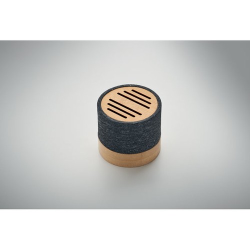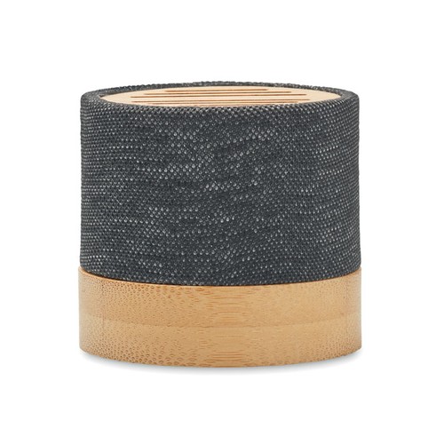 Haut- parleur sans fil 5.0 en RPET détail et bambou. Témoin LED. 1 Batterie rechargeable Li- ION 300 mAh incluse. Port pour carte SD et câble AUX/USB inclus. Données de sortie : 3W, 3 Ohm et 5V. Durée de lecture d'env. 3h. Le bambou est un produit naturel, et présente de légères variations de couleur, de décoration et de tailles.