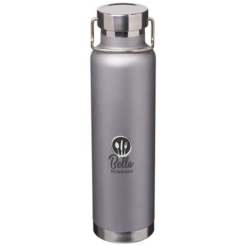 Bouteille en acier inoxydable recyclé à double paroi, certifiée RCS, avec isolation sous vide en cuivre qui conserve les boissons chaudes pendant 12 heures ou froides pendant 48 heures. Comprend un couvercle à vis en acier inoxydable recyclé et une poignée en acier inoxydable durable. Large ouverture pour un remplissage et un service confortable. Capacité : 650 ml. Présentée dans une boîte cadeau.