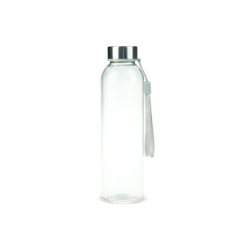 Bouteille d’eau en verre. Comprend une petite sangle au niveau du bouchon pour pouvoir la transporter plus facilement. Convient aux boissons froides, gazeuses et non gazeuses.
