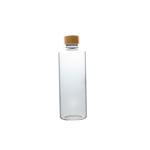 Verre borosilicate simple paroi. Bouchon vissé en bambou avec un joint en silicone. Compatible (sans le bouchon) avec lave- vaisselle. Housse de protection de la gourde en néoprène gris chiné. Contenance : 1 L.