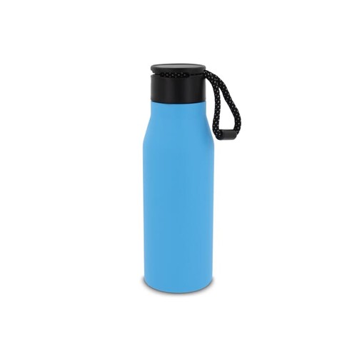 Bouteille isotherme double paroi avec une dragonne pour transporter plus facilement. L'extérieur a un design robuste. D'une contenance de 600ml elle est livrée dans un coffret cadeau.