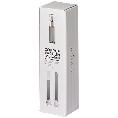 Bouteille en acier inoxydable avec isolation par le vide et placage en cuivre, ce qui vous permet de conservez vos boissons chaudes pendant 12 heures ou froides pendant 48 heures. La construction évite la condensation sur l'extérieur de la bouteille. Revêtement tendance et durable. Couvercle vissé en acier qui évite les écoulements et passant en acier. Large ouverture pour une utilisation plus agréable. Parfaite pour glisser des cubes de glace. Capacité : 650 ml. Sous coffret cadeau Avenue.