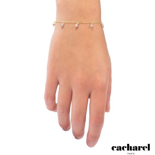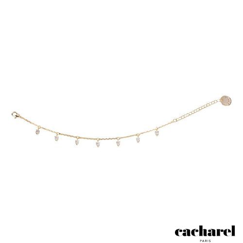 La collection de bijoux "Odeon" est un classique intemporel, qui conviendrait à tous les styles. Chacune des breloques est ornée d'un subtil zircon, ce qui lui confère une élégance discrète. Ce bracelet en or est luxueux et féminin. Sa taille est adaptable et il est terminé par une belle plaque gravée du logo iconique "Cacharel". Un must have.