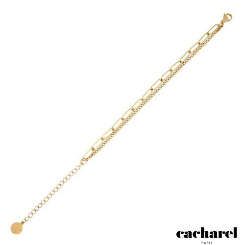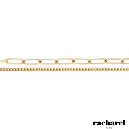 The Olympe bracelet plays with trompe- l’œil, creating the impression of two distinct chains in one seamless piece. A fine Cuban link meets a bolder oval chain for an elegant, minimal look that suits any style. Available in radiant gold or sleek silver and signed with a delicate Cacharel signature plate, it is a versatile statement of style for every day.