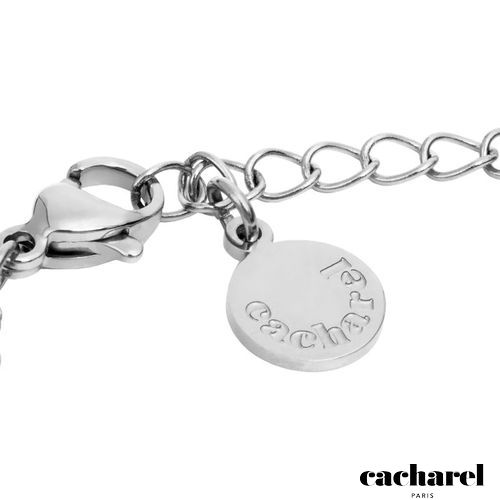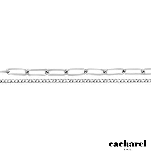 The Olympe bracelet plays with trompe- l’œil, creating the impression of two distinct chains in one seamless piece. A fine Cuban link meets a bolder oval chain for an elegant, minimal look that suits any style. Available in radiant gold or sleek silver and signed with a delicate Cacharel signature plate, it is a versatile statement of style for every day.