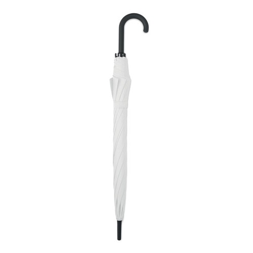 Parapluie droit 23 pouces avec armature en métal plaqué noir, baleines en fibre de verre et panneaux en tissu pongé 190T. Embouts et pointe en plastique. Poignée courbe en plastique PP caoutchouté. Ouverture automatique et fermeture manuelle.