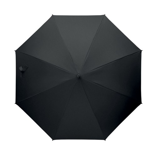 Parapluie droit 23 pouces avec armature en métal plaqué noir, baleines en fibre de verre et panneaux en tissu pongé 190T. Embouts et pointe en plastique. Poignée courbe en plastique PP caoutchouté. Ouverture automatique et fermeture manuelle.