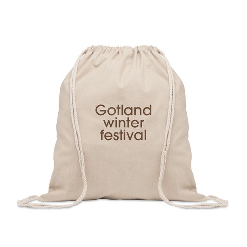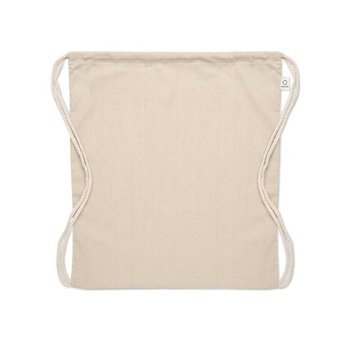 Sac à cordon en coton recyclé pré- consommation (70 %) et RPET (30 %). 140 gr/m². Cet article peut rétrécir après avoir imprimé.
