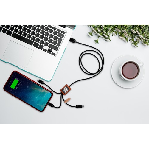 Câble 3- en-1 d'une longueur de 1 mètre avec logo lumineux et multi- connecteur (Type C, Micro USB, iPhone). Le câble peut charger 2 à 3 produits à la fois.