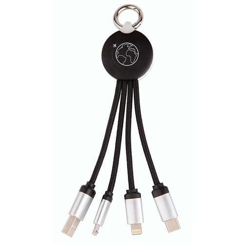 Câble rond avec double logo lumineux recto/verso pour type C, iPhone et Android et cordons en rPET (plastique issus de bouteilles recyclées). Finition métal, rubber soft touch sur l'import / rABS satiné sur le stock. Disponible en 15W et 20W.