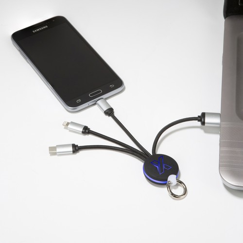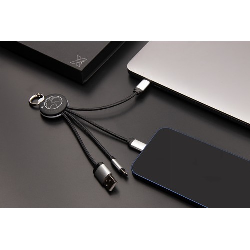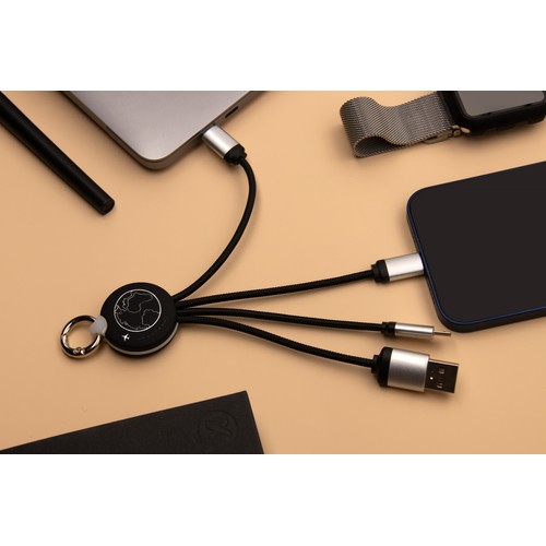 Câble rond avec double logo lumineux recto/verso pour type C, iPhone et Android et cordons en rPET (plastique issus de bouteilles recyclées). Finition métal, rubber soft touch sur l'import / rABS satiné sur le stock. Disponible en 15W et 20W.