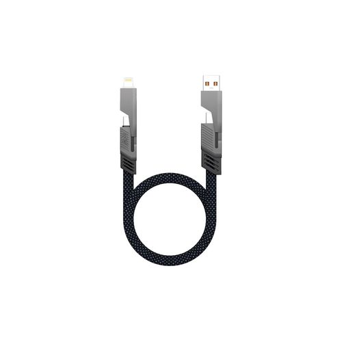 4 connectiques en 1 pour ce câble universel permettant de charger depuis des prises USB- A ou USB- C vers des prises USB- C ou Lightning. Charge rapide (60W max) et transfert de données USB 2.0 avec débit de transmission de 480Mbps. Structure en nylon et câble en cuivre. Attache en velcro incluse. Longueur : 1m.