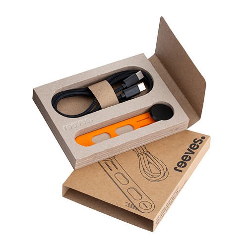 REEVES- Convertics Tie est une exclusivité de REFLECTS®, alliant parfaitement design créatif et fonctionnalité exceptionnelle. L'attache- câble en silicone est disponible en six variantes de couleurs, du rouge vif et orange intenses au noir et blanc intemporels. Avec l'attache- câble, le câble USB- C vers USB- C inclus peut être facilement attaché et emporté. Pendant la charge, vous pouvez fixer le câble de charge d'1 mètre de long dans les fentes prévues du support de câble. Ainsi, vous évitez toute perte potentielle du support. Le câble de charge en plastiques PET et TPE recyclés offre une puissance allant jusqu'à 60 watts. Il est idéal pour une charge rapide et le transfert de données. Le revêtement textile offre en outre une apparence de haute qualité. La plaque ronde en aluminium recyclé sur le support de câble offre la scène parfaite pour votre logo. La publicité peut être réalisée par gravure laser, tampographie ou doming. Un emballage cadeau de haute qualité complète l'article.