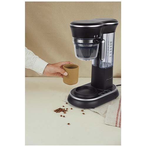 Grâce à la cafetière avec moulin Capri, profitez des arômes et du goût uniques des grains de café fraîchement moulus. Elle est idéale pour les grands amateurs de café, car vous pouvez choisir la quantité d'eau (jusqu'à 450 ml) et de grains (jusqu'à 50 g) pour préparer le café à votre goût. De plus, elle comprend une tasse en aluminium de 450 ml avec couvercle pour déguster votre café en déplacement.