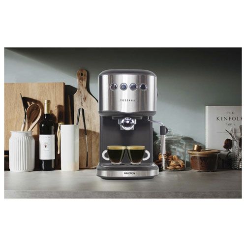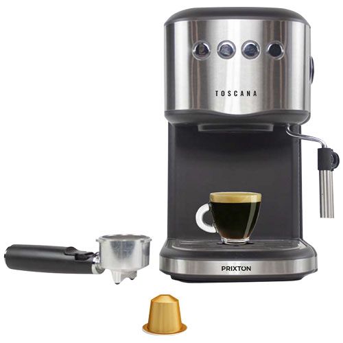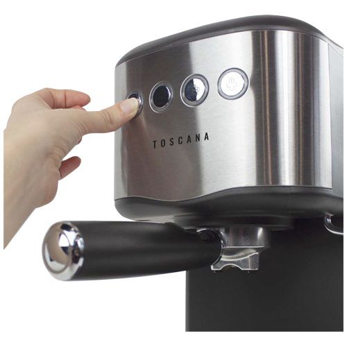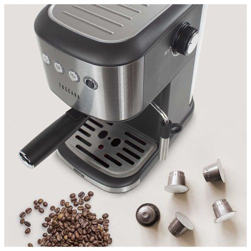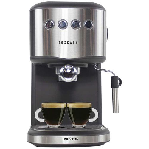 La cafetière toscane intègre le système italien et dispose d'un double filtre de sortie qui permet de préparer deux cafés en même temps. Elle dispose d'un vaporisateur réglable intégré pour la préparation de cappuccinos. Dotée d'un adaptateur pour capsule, d'un plateau antigoutte, d'un plateau chauffant pour tasse, d'une cuillère à mesurer et d'un broyeur à café. La cafetière dispose d'une fonction d'arrêt automatique après 20 minutes de non- utilisation. Puissance de 850 W. 20 bars de pression. Réservoir d'eau d'une capacité de 1,25 l. Système d'économie d'énergie ERP.