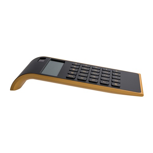 Calculette de bureau belle et élancé avec double alimentation (solaire et pile). Les côtés de la calculette sont colorés, ce qui forme un joli contraste avec sa surface noire toute simple. Les touches plates de la calculette de poche solaire sont noires avec une impression or. La surface personnalisable bien visible peut être décorée d’un logo avec une impression au tampon (1 à 4c) ou UV. L’écran affiche 10 chiffres et la pile est comprise.