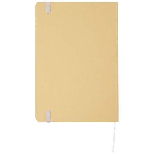 Carnet A5 à couverture rigide en carton recyclé avec 80 feuilles lignées en papier 70 g/m². Le carnet est doté d'une fermeture élastique, d'un ruban et de coins arrondis.