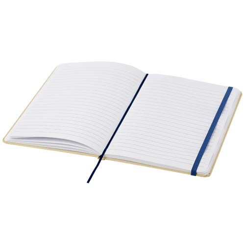 Carnet A5 à couverture rigide en carton recyclé avec 80 feuilles lignées en papier 70 g/m². Le carnet est doté d'une fermeture élastique, d'un ruban et de coins arrondis.