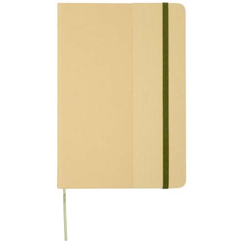 Carnet A5 à couverture rigide en carton recyclé avec 80 feuilles lignées en papier 70 g/m². Le carnet est doté d'une fermeture élastique, d'un ruban et de coins arrondis.