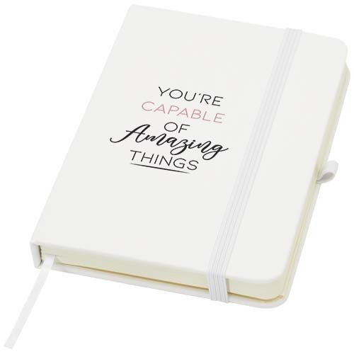 Le carnet à couverture rigide Spectrum Plus A6 à coins arrondis constitue non seulement un accessoire de bureau indispensable, mais aussi une excellente occasion de promouvoir votre marque. Ce carnet est pourvu d’une couverture douce et de 80 feuilles lignées de couleur crème de 70 g/m², idéales pour noter les pensées qui vous passent par la tête, comme du texte plus long. Ce carnet est doté d’une boucle pour stylo, d’une fermeture élastique, d’un ruban marque- page et d’une pochette en accordéon.