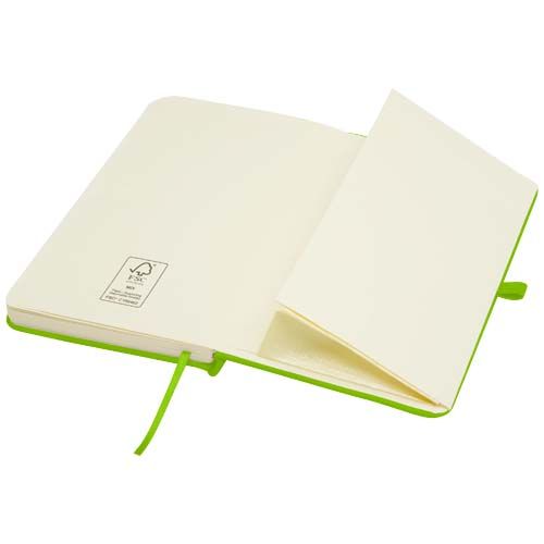 Le carnet à couverture rigide Spectrum Plus A6 à coins arrondis constitue non seulement un accessoire de bureau indispensable, mais aussi une excellente occasion de promouvoir votre marque. Ce carnet est pourvu d’une couverture douce et de 80 feuilles lignées de couleur crème de 70 g/m², idéales pour noter les pensées qui vous passent par la tête, comme du texte plus long. Ce carnet est doté d’une boucle pour stylo, d’une fermeture élastique, d’un ruban marque- page et d’une pochette en accordéon.