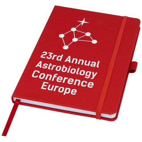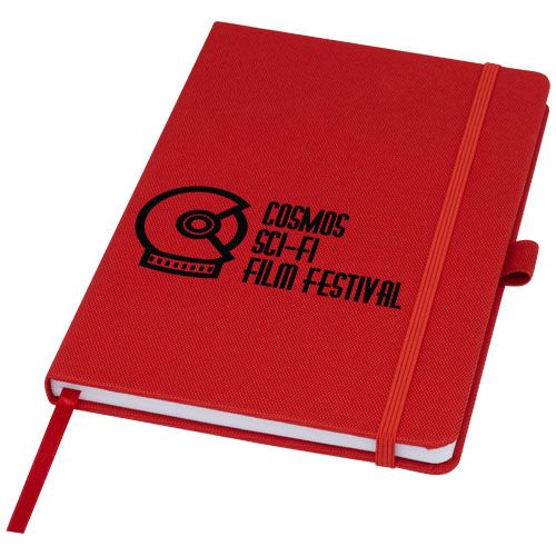 Carnet A5 avec couverture en tissu RPET. Comprend 80 feuilles en papier recyclé de 70 g/m², une boucle pour stylo et un marque- page ruban.