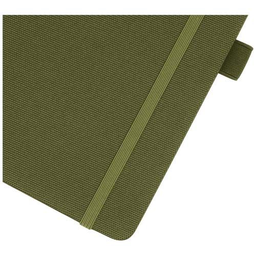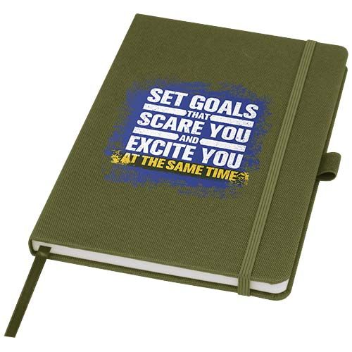 Carnet A5 avec couverture en tissu RPET. Comprend 80 feuilles en papier recyclé de 70 g/m², une boucle pour stylo et un marque- page ruban.
