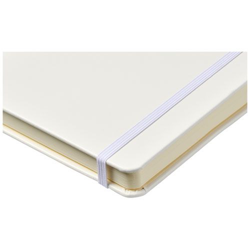 Cahier A5 (14,2 cm x 21,4 cm) en cuir PU avec élastique, ruban marque- page, boucle à stylo et poche arrière en accordéon. Comprend 96 feuilles de papier crème lignées en 80 g/m² et est livré dans une pochette blanche Journalbook.