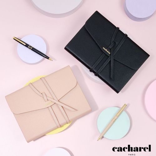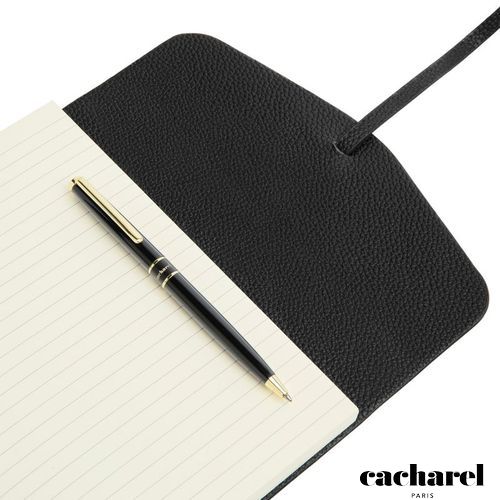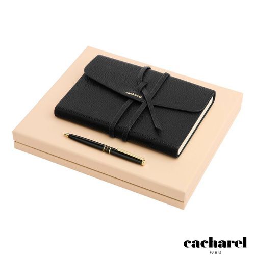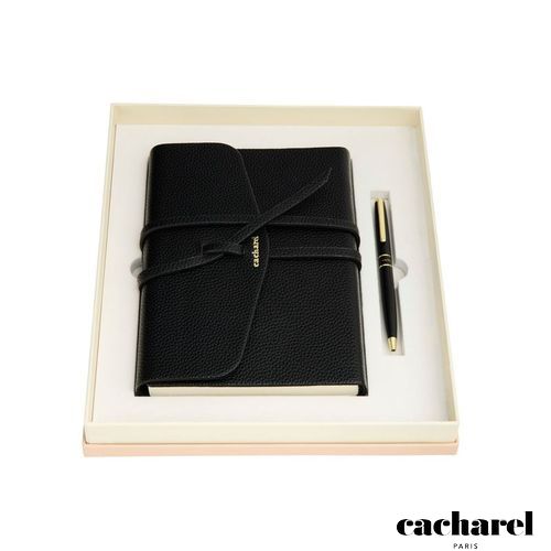 Coffret stylo et carnet assortis avec élégance.Le cadeau parfait, soigneusement présenté dans son coffret sur mesure. Stylo raffiné et luxueux, au design minimaliste et féminin.Carnet en imitation cuir grainé, orné de la signature Cacharel en TPU doré. Palette de couleurs intemporelle et classique : Noir et Nude